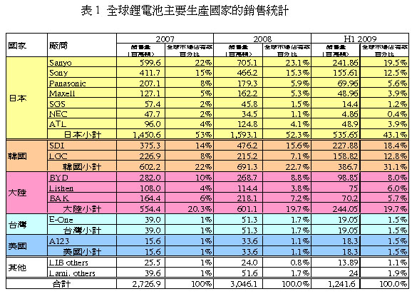 如以国家区分, 2007年到2009年上半年的全球锂电池芯产业市场佔有率分析,主导国家为日本, 2008年以前日本的全球市场佔有率达50%以上,其次为韩国的23%及中国大陆的20%(不含ATL),但2009年上半年有明显变化,韩国厂商的全球市场佔有率提升至31%,日本厂商(含ATL)则下滑至43%,韩国与日本的差距拉近之中,中国大陆则维持20%的市场佔有率,至于台湾部份,则持续维持约1.5~2%的全球市场佔有率。