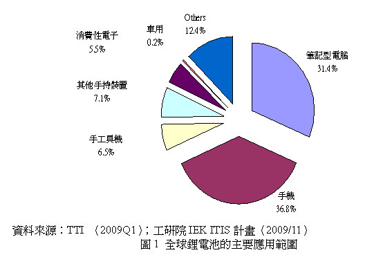 根据IIT的销售统计,全球锂电池芯的44%用在手机及手持装置、31.4%用在笔记型电脑及5.5%用在其他消费产品,此三种应用已涵盖80%的锂电池芯需求,主要应用统计如图1。