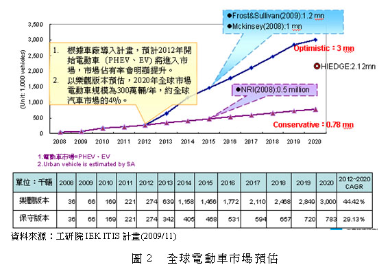 近年来,因应气候变迁及降低石油依赖等考量因素,全球各主要国家积极发展低污染与低(零)油耗的电动车,促成锂电池产业在原有应用领域之外的新需求。根据各国的补助政策及车厂推出的电动车计画,预计电动车将在2012年开始进入小规模量产,同时,以较乐观的成长率推估,预期在2020年可达到年销售量300万量的规模,未来市场预估如图2。
