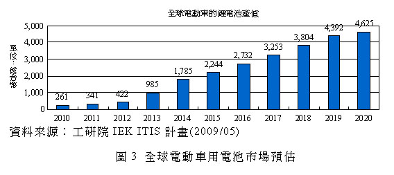 再者,根据2020年全球电动车年销售量300万量的规模,以70%为PHEV及30%为纯电动车(BEV)的电池需求预估,则2020年全球车用电池的产值为4,625亿台币如图3所示。