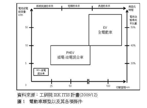 2009年車用鋰電池目前佔整體鋰電池應用約1%市場比重很小,使用到電池做為電力系統的電動車型態包括HEV、PHEV、EV,這三種車輛可行駛的里程以及對於電池容量的要求如圖1。對於電池能量的需求、一次充電後可行駛的里程以及電池組佔整車成本的比重都是EV>PHEV>HEV,當然EV是最理想的電動車型態,但是以目前的電池材料技術尚難以達到,所以電動車的發展也仍然必需循序漸進的進行。由使用電池數量較少的HEV先用,再逐步擴展到EV市場。