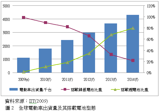 2009年全球汽車出的出貨量約為6300萬台,當中電動車出貨量約為110萬台,目前電動車市場份額小,而且以鎳氫電池為主,不過在鋰電池持續的發展下相當有機會在2013年就取代鎳氫電池成為電動車用電池的主要電池型態。依照IIT在2009年的預估,全球的電動車用電池型態在2012年就會有很明顯 的改變,到2012年鎳氫電池約佔全球電動車比重的六成五、鋰電池佔三成五,到2013年就會出現黃金交叉點,鋰電池佔全球電動車比重的六成八、鎳氫電池 佔三成二,顯示隨著時間的經過鋰電池的安全性以及電容量得到實證的支持,會讓鋰電池的飛輪在未來快速起飛,如圖2。