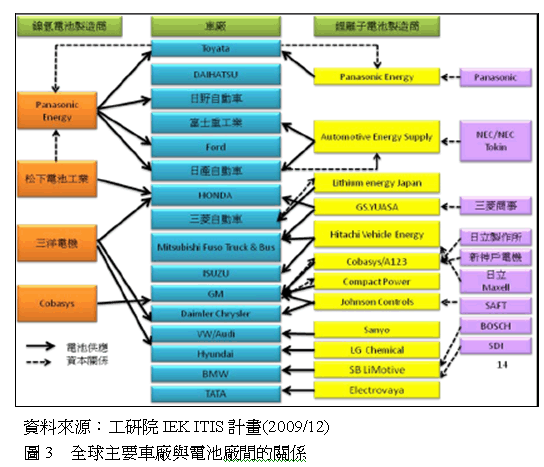 全球車用電池廠商以Sanyo、Cobasys、Panasonic為首,而隨著HEV、PHEV、EV..等話題不斷的吵熱,也吸引越來越多廠商投入市場。當前電池芯廠商的家數相較於全球車廠的家數少,所以車廠與電池芯廠間如何取得合作關係以確保電池芯的來源就相當重要。當前各家車廠與電池芯廠的合作關係如圖3,當前重點的歐美、日系以及韓系的車廠都己有確切的合作結盟廠商。