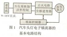 为了满足灯在启动与稳态时的不同要求,目前,一般采用的汽车头灯用电子镇流器的基本电路结构包含图1所示的4部分功能。