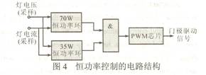 由图3可知,全桥逆变电路的总体负载只有灯消耗有功功率,因此灯消耗的功率可近似看作是逆变器的输入功率。所以通过不断采样灯回路上的输出电压Uo和输出电流Io,采用抛物线近似的恒功率控制方法,用模拟电路来实现可使控制精度达到±5%左右的恒功率控制。但是,汽车头灯比较特殊,为了要满足其在4s内达到额定光输出的80%这一特殊要求,一开始提供70W的瞬态功率给灯,而汽车头灯的额定功率为35W。所以,在设计时需要两个恒功率控制环,两者的切换通过一个门电路来实现,图4示出恒功率控制的电路结构