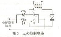 点火方式采用脉冲式点火,电路采用倍压整流电路。图5示出点火控制电路。全桥逆变器输出的正向电压先把VD2导通,给电容C2充电;输出的负电压把VD1导通,给C1充电。当每个电容都充电到400V时,可使800V的气体放电管触发导通,开始放电。这样,当变压器初级产生800V脉冲时,次级就会产生上万伏的高压脉冲,从而将高强度的气体放电管雪崩击穿。