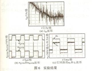 在前述原理分析和实现方案讨论的基础上进行了实验论证。实验样机是额定功率为35W汽车头灯电子镇流器。升压电路采用反激式电路,选用UC3843作为PWM控制芯片。主要电路参数有:反激式电路的MOSFET开关管选用的IRF540;二极管选用MUR860,变压器的初级电感Lp=7.8µH,输出电容选择耐压为630V的1µF的CBB电容。图6b示出反激式变换器稳态下开关管的驱动电压UgVM和开关管漏源极两端的电压UdsVM实验波形??杉?,UdsVM有一个很大的尖峰,是漏感的能量所致。图6c示出稳态时两端的电压uo及其流过灯的电流io实际工作波形。由图可见,灯两端的输出功率将近达35W,这与理论设计符合得很好。