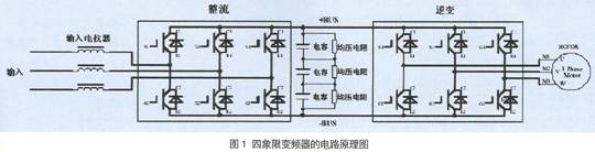 普通的变频器大都采用二极管整流桥将交流电转化成直流,然后采用IGBT逆变技术将直流转化成电压频率皆可调整的交流电动机。这种变频器只能工作在电动状态,所以称之为两象限变频器。由于两象限变频器采用二极管整流桥,无法实现能量的双向流动,所以没有办法将电机回馈系统的能量送回电网。在一些电动机要回馈能量的应用中,比如电梯,提升,离心机系统,只能在两象限变频器上增加电阻制动单元。将电动机回馈的能量消耗掉。另外,在一些大功率的应用中,二极管整流桥对电网产生严重的谐波污染。