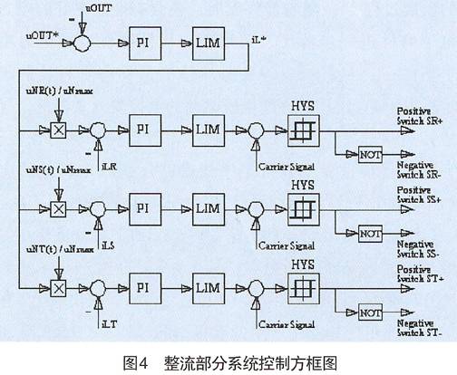 如图4所示,系统的给定是直流母线电压指令,这个指令与直流母线电压反馈的误差送到电压环的PI调节器。电压环的PI调节与三相输入正弦波的乘积成为三相电流的指令,三相电流指令与各自电流所馈作比较,误差送到电流环的PI调节器。电流环PI调节器的输出可以通过载波调制产生各相IGBT的PWM控制信号,也可以通过空间矢量的方式产生PWM信号控制IGBT。上述的运算都是通过DSP完成的。