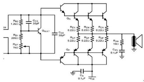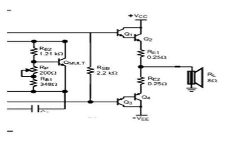 改善交越失真的最有效方法便是减少RE的电阻。对于相同数值的RE,一个平行形式的输出可降低用来改善线性度的整体RE电阻值。同时,假如每一个级的RE都较大,那便可为输出晶体管带来更佳的匹配性和电流平衡。此外,RE也关系到输出的功率损耗。对于一个相同的RE,较大的输出电流会导致较大的功率损耗。RE的值取决于并联输出晶体管的数量和扬声器的负载。建议采用足够功率的0.1到0.5Ω电阻器。