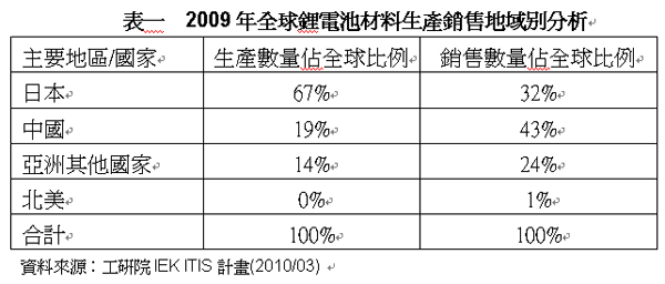 在生产与销售地区上,在2009年仍然呈现集中于亚洲的态势,其中日本仍为最主要的正极材料生产与销售大国,虽然在日本国内因生产成本高涨之故,锂电池的制造出口逐年下降中,但至今全球仍有近67%的锂电池正极材料在日本生产,中国与其他亚洲地区仅占19%与14%。至于在销售地区分布上,由于下游的电池大厂仍以日商为多,因此日本仍为销售地区比例最高的国家,其他依序为中国、其他亚洲地区、北美等地。