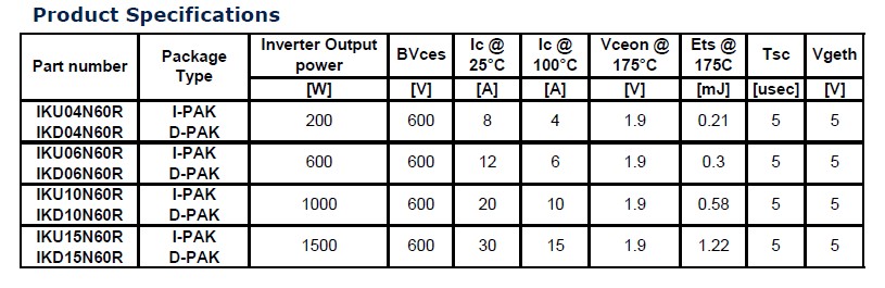 目前这种逆向导通型IGBT有两种封装形势,一种是IPAK封装,另外是DPAK封装,电流有4安、6安、10安和15安四个等级。它主要的特点就是有非常低的价格,还有节省空间。半导体器件它的成本主要取决于两个方面,一个是它的晶圆,减少晶圆的数量,从两个晶圆减少到一个晶圆可以减少成本。另外的话,这种T0220的封装还有这种D2PARK封装可以减少成IPARK封装和DPARK封装,同时减少封装的成本,减少了封装的话同样会减少它的空间,但是减少了晶圆的话会不会对它的性能造成影响?首先我们来看一下,同样它有一个非常低的饱和导通压降,对它的性能丝毫没有任何影响。另外可以通过改变门级驱动电阻,在宽范围调节它的开通和关断的时间,有一个非常好的EMI效果,非常平滑的开关波形,5us的短路?;つ芰?,最高结温可以达到175度。这个是这种逆向导通型IGBT的主要参数,这个是它的击穿电压,这个是它的电流,这是175度饱和导通压降,这是开关的能力,这是短路?;さ哪芰?,这是它的门级驱动电压,基本上对于一个200W的产品可以选择4安的IGBT,600W的话可以选择一个6安的,1000W可以选择一个10安的,1500W的可以选择15W的产品。
