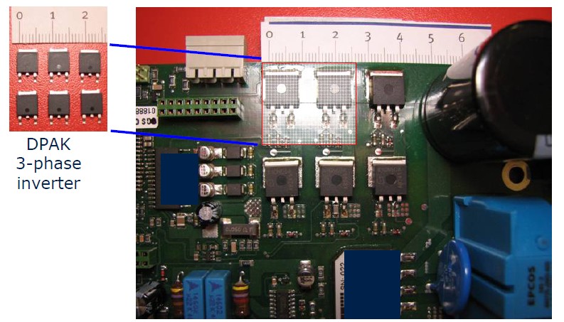 这是一个实际的PCP板上的IGBT的图,我们看到如果用D2PARK的话,它两颗的面积大概在2.5厘米,而如果使用DPARK封装的话可以减少到1.5厘米左右,同时它跟IGBT??槔聪啾鹊幕翱梢越谑?.5个美金的成本,所以对于一些消费类市场低成本的产品这个相当重要的。