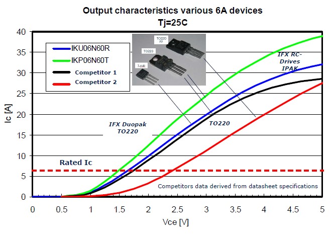 总结一下IGBT的重要特点,一个是成本,因为它采用的是一个晶圆,所以它的成本有很大的优势;另外因为减少了它的封装,可以给PCB留下更多的空间,进一步提高产品的功率密度。同时它也有一个非常好的性能,非常低的饱和导通压降,一个非常软的开关特性对EMI非常有帮助,它还有一个很好的温度特性,最高温度可以达到175度。蓝色曲线是逆向导通型IGBT和目前TO220封装的饱和导通压降的比较。这是用一个6安的产品在做比较,当这个电流在6安的时候可以看到饱和导通压降非常的低。
