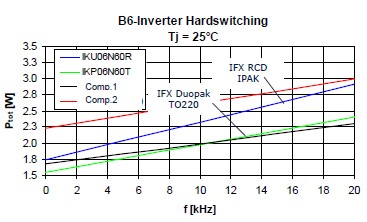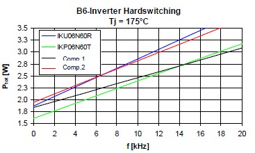 这个是25度损耗的时候,这个是175度损耗的时候,可以看到蓝色的这根线,基本上它的损耗跟这个TO220封装产品相差并不是很大。这个是在基于刚才基础上做的一个损耗分析,首先频率在4K赫兹的时候可以看到,这个浅蓝色的就是二极管的开关损耗,这个是二极管的导通损耗,这个是IGBT的开关损耗,这个是IGBT的导通损耗??梢钥吹皆?K的情况下导通损耗这一部分和这一部分是占了绝对支配地位的。所以对于一个低频应用来说减少它的饱和导通压降对于IGBT是相当的重要,当它的频率升高的时候,它的开关损耗就会稍微升高一点。