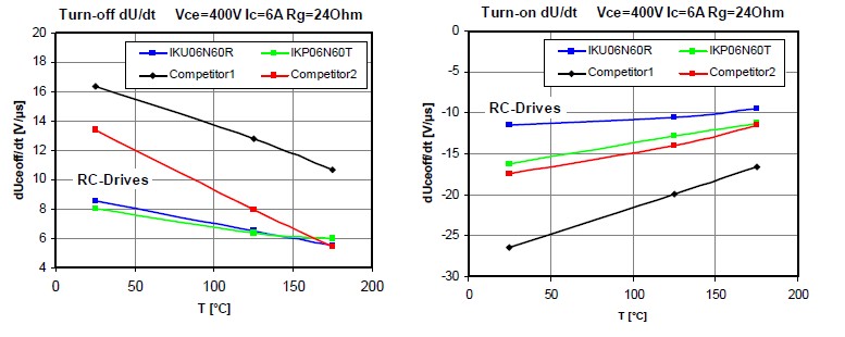 再加上不同的驱动电阻,这个时候我们也对dV/dt进行了一个测试,然后可以看到基本上我们的dV/dt都比我们的竞争对手或者市面上的产品会优异很多。因为减少IGBT的dV/dt的话可以减少前级的EMI滤波器的要求,同样也可以减少成本,所以这个产品不仅在本身的价格上面有优势,同样也可以整体的减少系统的成本。