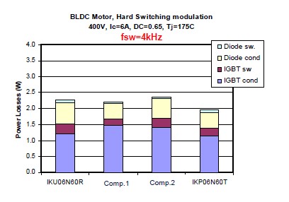 衡量一个IGBT的好坏有两个非常重要的指标,一个就是它的饱和导通压降,就是Vce(sat),另外一个就是开关损耗,也就是Eoff。对于低频的应用来说,饱和导通压降是占有绝对支配地位的,所以选择这种RC-Drives的IGBT会是一个非常好的选择,因为可以看到这种RC-Drives IGBT的饱和导通压降是远远低于市面上的一些产品。这个是在一个无刷电机上面的损耗的分析。