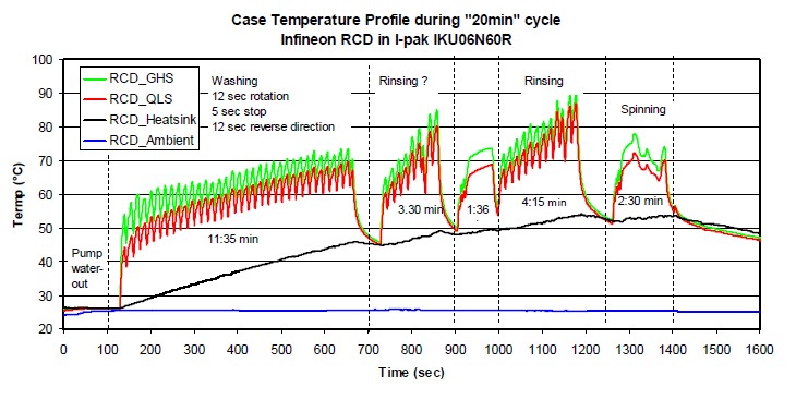 同时跟这种TO220的封装的IGBT也做了一个温度的比较,我们会发现TO220封装的IGBT温度会比逆向导通型IGBT会低10度到15度,但是这个对于IGBT没有任何影响。为什么呢?因为通常这种TO220的封装的IGBT最高结温是150度,而逆向导通型IGBT是175度,所以它实际能力还是比这个要高,这是这种逆向导通型IGBT的优势。为了进一步来确认一下这个温度的应力,然后我们把这个测试放在一个密闭的环境当中再来看它的表现,就是说我们来开动洗衣机使它的环境温度平衡在40度这个环境上,就是从25度上升到40度,然后再来检测IGBT的温度,我们仍然可以发现基本上它的最高温度仍然没有超过90度,所以对于一个结温在175度的情况下,它有一个相当大的裕量。