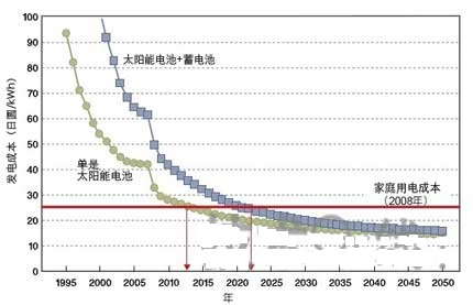 如同人们经常指出的,太阳能发电确实也有缺点:下雨时输出会很低,在阴天及其他情况时会有大幅波动,而且在夜晚时为零。然而,透过使用蓄电池后可以克服大部分的问题。如果配有蓄电池的太阳能发电系统达到与市电同价后,将会有很大的冲击(其中包括减少石化燃料消耗)。日本经济产业研究所(RIETI)已预估大约2022年,配有蓄电池的家用太阳能发电系统将达到与市电同价(图10)。