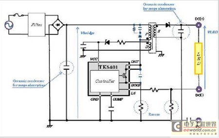 创意电子新近推出的TK5401就是这样一款LED驱动电源IC,它具有不需要DC电源特性中所必须的电解电容的特性,使得LED寿命高达4万小时以上。据介绍,TK5401封装内置了高电压功率MOS管及控制电路,因去除电解电容实现了小型化、低成本,并且实现了LED灯的长寿命和高效能。