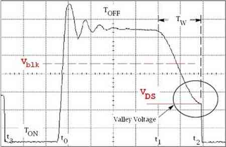 在这一条件下,得到的二次电压不足以使电压VDS为零,只是得到了电压谷值。图2显示了准谐振反激式变换器的典型VVS工作模式。若符合方程1的条件,则谷值电压将为零,从而获得ZVS。