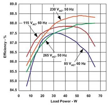 总之,更严格的节能标准要求创新的电源技术,电源需要在整个负载范围内都有很高的效率,并可极大节约能源?;诟涸靥跫?,操作不同模式下的使用准谐振控制和跳脉冲技术的反激式变换器可阐明它对AC/DC应用中的节能进行优化的有效性。新开发的IC(如TI推出的UCC28600)是符合新节能标准的最优解决方案之一。图3提供了效率的典型测试结果,而图4则显示了在连接于通用离线输入(带单一18Vdc输出)的65W反激式变换器中使用UCC28600的准谐振控制和跳脉冲技术的待机功率。
