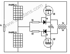 系统投入运行后,假设Ua>Ub,电压环比例积分调节器的输出高电平封锁Q2的驱动电路,TL494的调制脉冲输出端A(8脚)输出PWM方波无效,只有Q1导通,功率从PANEL A流向PANELB,Ua下降,Ub上升,最终Ua=Ub。反之,Ua<Ub,电压环比例积分调节器的输出高电平封锁Q1的驱动电路,TL494的调制脉冲输出端B(11)脚输出PWM方波无效,只有Q2导通,功率从PANELB流向PANELA,Ua上升,Ub下降,最终亦Ua=Ub。