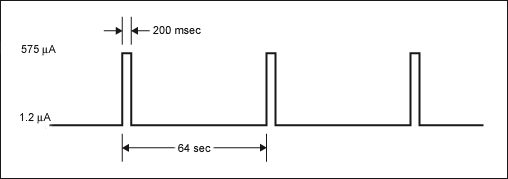 周期性地测量温度使得器件在短时间内(最差情况下为200ms)的电流损耗增大。图1给出了DS3231在最差情况下的电流损耗,计算中假设电池电压为3.63V,I²C兼容接口不工作。