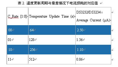 表2列出了DS3232/DS3234温度更新周期与最差情况下电流损耗的对应值。计算中假设电池电压为3.63V,I²C兼容接口不工作。C_Rate位上电时默认为0,对应于64s的温度更新周期。