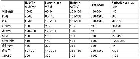 注:NA-数据不详、a-C/3放电率、b-80%DOD、c-机械重充电、d-仅供参考、USABC-美国先进蓄电池协作体。