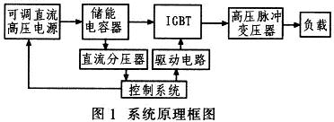 系统工作过程如下:由控制系统控制可调直流高压电源给储能电容器充电,当充电电压达到设定值后,再控制IGBT按照设定的频率和脉冲宽度导通,产生脉冲电压加在高压脉冲变压器原边,最后由高压脉冲变压器升压,产生所需的高压脉冲加在负载上。