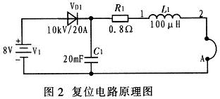 图2中,V1为低压直流电源,R1为限流电阻。由V1通过R1提供一个直流电流给单匝复位线圈A。在高压脉冲变压器工作时,单匝线圈A上会感应较高的电压,利用电感L1,电容C1和高压硅堆VD1对低压直流电源V1进行?;?。
