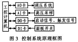 控制系统原理框图如图3所示。通过计算机控制AO卡(模拟量输出)输出0~10V的模拟量,用来控制调压系统中的可控硅调压器的输出。储能电容器上的电压经过高压采样和AI卡(模拟量输入),由计算机采集。计算机控制DO卡(数字量输出)输出控制信号控制各类启动开关和IGBT驱动板输出触发信号。各类手动面板的开关信号经过DI卡(数字量输入),由计算机采集。