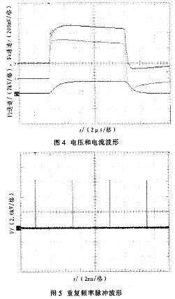 对系统各部分进行调试。用高压探头测试电压波形,用罗果夫斯基线圈测试电流波形。测试的实验波形如图4、图5和图6所示。