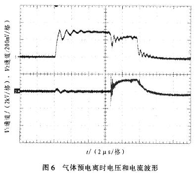 图4中,纵坐标为电压幅度值(2通道2kV/格,4通道200mV/格)。通道2为电压波形,电压约为5kV,脉冲宽度为10μs,上升沿小于lμs。通道4为电流波形,电流值约85A(波形图中比例为l:500)。图5中,脉冲周期为5ms,重复频率为200Hz。图6中,纵坐标为电压幅度值(1通道5kV/格,2通道2V/格)。l通道为放电电压波形,2通道为放电电流波形。从波形图中可以看出,脉冲当电压加在气体上时,大约经过几微秒时间后,气体发生电离。此时由于分压原因,电压幅值略有下降,电流波形开始出现。在脉冲电压加载期间,气体维持了电离状态。