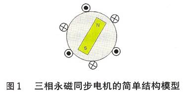 三相混合式步进电机的工作原理十分类似于永磁同步伺服电机。其转子上所用永磁磁铁同样是具有高磁密特性的稀土永磁材料,所以在转子上产生的感应电流对转子磁场的影响可忽略不计。在结构上,它相当于一种多极对数的交流永磁同步电机。由于输入是三相正弦电流,因此产生的空间磁场呈圆形分布,而且可以用永磁式同步电机的结构模型(见图1)分析三相混合式步进电机的转矩特性。为便于分析,可做如下假设: