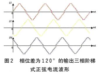 以上分析表明,对于三相永磁同步电机,当三相绕组输入三相对称的正弦电流时,由于在内部产生圆形旋转磁场,电机的输出转矩为恒值。因此,将交流伺服控制原理应用到三相混合式步进电机驱动系统中,输入的220V交流,经整流后变为直流,再经脉宽调制技术变为三路阶梯式正弦波形电流(见图2),它们按固定时序分别流过三路绕组,其每个阶梯对应电机转动一步。