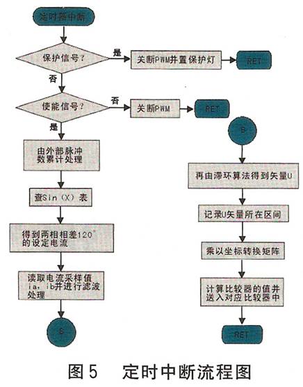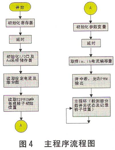 图4示出主程序流程图,图5示出定时中断流程图。为减少功耗和?;さ缁?,设置了自动半电流功能(静态锁轴或没有脉冲输入时电流减半),它由滞环比较器自动进行调节。