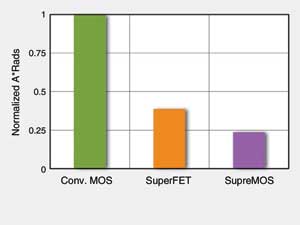 在需要最低RDS(on)与快速切换的应用中,新的平衡型器件,例如SupreMOS与SuperFET,可提供最大的优势。一般而言,SuperFET器件在RDS(on)要求为0.5~1Ω之时优势最大。而SuperMOS在RDS(on)低于0.5Ω时优势明显。这一差异又是由于热阻的作用。