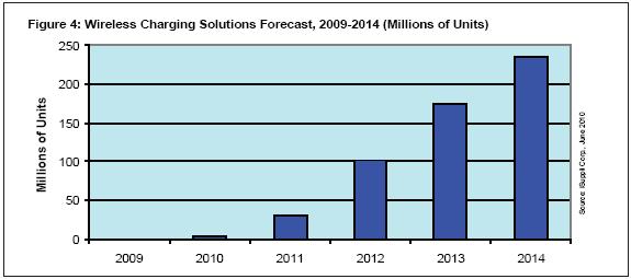 在产品专用无线充电方面,预计2010年解决方案将增长到360万个,而去年只有20万个。从明年开始,出货量将急剧增长:2011年出货量将达到3100万个,2012年上升到1.018亿个,2013年达到1.742亿个,2014年底增长到2.349亿个。预计无线充电售后市场的增长同样惊人,五年的复合年度增长率高达133.4%,到2014年总体销售收入将增长29亿美元。产品专用解决方案包括充电器以及所谓的“皮肤”,即与特定产品一同销售的接收器,而售后市场解决方案则包括通用充电器和可以与多种消费电子设备配合使用的各类皮肤。