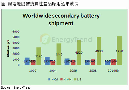 Energy Trend 表示,在消费性产品领域的二次电池领域中,镍镉电池的历史最为悠久,但是因为在材料环保方面,受到质疑,包括欧洲地区在内的一些先进国家,限制镍镉电池仅能在医疗以及军事等特殊用途使用。至于镍氢电池的使用上,过去普遍使用在数字相机等消费性产品上面,但是随着产品诉求逐渐朝向轻薄发展,使得镍氢电池的市占率逐渐缩小。