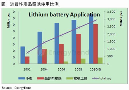 消费性产品的发展趋势迅速牵动电池产业,根据集邦科技(TrendForce)旗下研究部门 EnergyTrend 表示,锂电池随着量产数量增加,价格与性能也逐渐为消费者所接受,包括手机电池与 NB 电池,也以锂电池为使用主流,而伴随着新材料的革新,动力锂电池也成功在电动工具以及两轮车辆上崭露头角,让锂电池突破仅有消费性产品的应用局限。