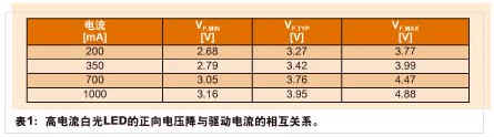为了确保最佳的性能和长久的工作寿命,LED需要一个有效的驱动电路。这些特殊的驱动电路必须能够从一根相当苛刻的汽车电源总线获取工作电源,而且还应兼具成本和空间“效益性”。为了维持其长久的工作寿命,一定不得超过LED的电流和温度限值。表1罗列了针对一个高电流白光LED的典型正向电压与驱动电流的相互关系。