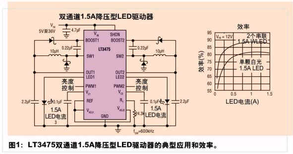 LT3475是一款双通道、36V、2MHz降压型DC/DC转换器,专为用作恒定电流双LED驱动器而设计(见图1)。每个通道具有一个内部检测电阻器和调光控制功能,从而使其非常适合于驱动那些需要高达1.5A电流的LED。一个通道的开关操作与另一个通道异相180°,因而使得两个通道的输出纹波均有所减小。每个通道均独立地在一个50mA至1.5A的宽电流范围内保持了很高的输出电流准确度,而独特的TrueColorPWMTM电路提供了一个3000:1的调光范围,且未发生任何的色偏移(这种现象在LED电流调光中很常见)。