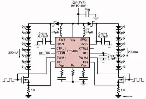 为了实现这些LED刹车灯的性能和工作寿命的最大化,应采用一种能够驱动这些刹车系统所需的红光LED串的合适LED驱动器,这是必不可少的。凌力尔特的LT3486便是专为此类汽车应用而开发的。LT3486是一款双通道升压型DC/DC转换器(如图2所示),专为从一根12V至14V汽车总线以恒定的电流来驱动多达16个LED(每个转换器驱动8个串联LED)而设计。采用LED串联的方式能够提供相等的LED电流,从而获得均匀的LED亮度。在需要的时候,两个独立的转换器还能够驱动不对称的LED串。