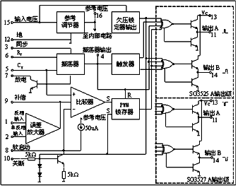 SG3525是美国通用公司的产品,如图2所示,内部电路主要由基准电源、振荡器、误差放大器、PWM比较器与锁存器、分相器、欠电压锁定、输出级、软启动以及关断电路等组成?;嫉缭词且桓龅湫偷娜宋妊蛊鳎瓤纱?,采用了温度补偿。作为内部电路的供电电源,并可向外输出40mA电流。振荡器由一个双门限比较器,一个恒流源及电容充放电电路组成,在芯片外部由5脚对地接一电容器,6脚对地接一电阻,5脚和7脚之间外接电阻即可构成该振荡器。