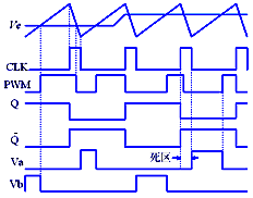 SG3525芯片各点的工作波形如图3所示,由误差放大器输出的电压Ve与锯齿波的交点可得一负的PWM信号。由PWM信号、时钟信号及分相器输出的Q(或)信号,根据或非门的逻辑可得两个或非门的输出信号Va和Vb。由波形图可以看出,PWM比较器的反相输入端电平越高,输出脉冲Va和Vb的占空比越大;反之越小。根据这一规律来实现该控制器的调压、软启动及?;すδ?。另外,可以通过改变5脚和7脚之间的外接电阻的大小,使时钟脉冲宽度变化来实现死区大小的调节。