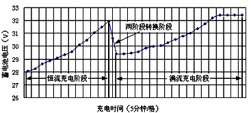 使用该蓄电池充电器对某型号航空蓄电池进行了充电试验,最大充电电流限制为30A,温度限制值定为350C。蓄电池的初始电压为20V,充电开始时,充电器以20A的电流对蓄电池持续充电约58分钟,然后以较小的电流3A对蓄电池进行涓流充电,直至蓄电池电压上升到32.45V时,蓄电池两端的电压不再发生明显的上升现象,此时充电器停止充电,历时150分钟,充电过程曲线示意图如图6所示。