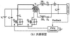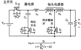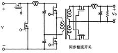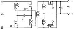 另外,如图3所示,在采用绝缘变压器的场合,研究人员还提出了将有源钳位电路嵌入推挽式转换器中的方案,可在采用48V输入和1.2V/70A输出的条件下实现高达91%的效率。上面讲到的几种电路方式基本上都是一段式结构,最近,出于进一步提高效率的考虑,人们正在加紧研发两段式结构的转换器。就普通的转换器而言,采用两段式结构将导致效率下降是人所共知的常识,然而,在低电压大电流转换器中,对输出进行同步整流是很普遍的做法,因此,如何实现同步整流操作的高效化便成为了关键所在。