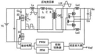 日本的研究人员开发成功一种振动型压电变压器,其厚度仅为4mm。该压电变压器的驱动电路采用方波逆变器,通过改变其开关频率(PFM方式)以达到借助压电变压器的谐振特性来调整输出电压的目的。但是,由于压电变压器具有多种由其形状所决定的谐振频率,所以很难通过大幅度地改变频率的做法来控制输出电压。为此,人们正在研究引入逆变器的脉宽调制(PWM)技术。图7示出了通过将驱动用逆变器、采用电流倍增器的整流电路以及采用PFM和PWM方式的混合控制电路与压电变压器相连而构成的压电变压器DC/DC转换器。